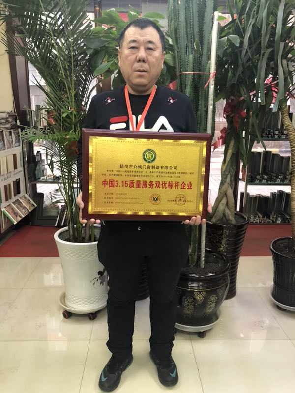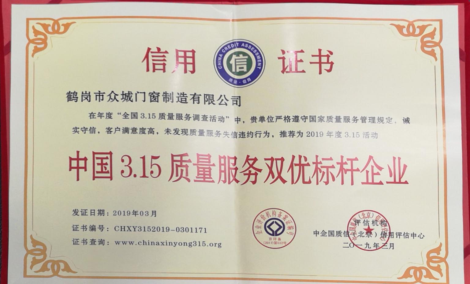 2019年3月11月,在北京召開的年度“全國(guó)3.15質(zhì)量服務(wù)調(diào)查”活動(dòng)中。鶴崗眾城門窗制造有限公司嚴(yán)格遵守國(guó)家質(zhì)量管理服務(wù)規(guī)定,誠(chéng)實(shí)守信、客戶滿意度高,未發(fā)生質(zhì)量服務(wù)失信失約行為。榮獲“中國(guó)3.15質(zhì)量服務(wù)雙優(yōu)標(biāo)桿企業(yè)”稱號(hào)。